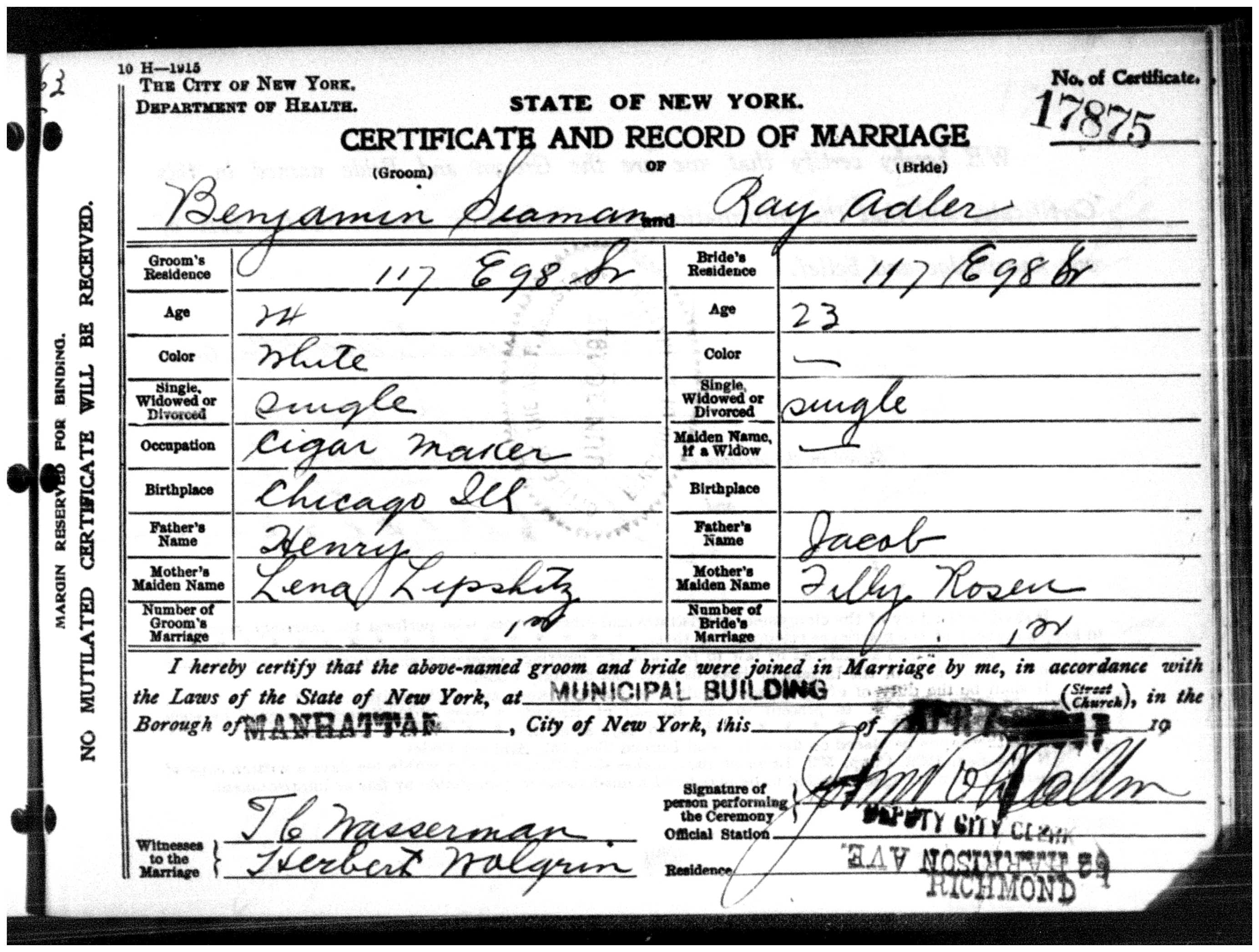 By 1930, however, Ray was living with her children in the home of her brother David Adler along with his wife Bertha and their daughter Tessie in Manhattan. Ben, on the other hand, was living in the Bronx with his mother and his brothers Samuel and Mannie Seamon.