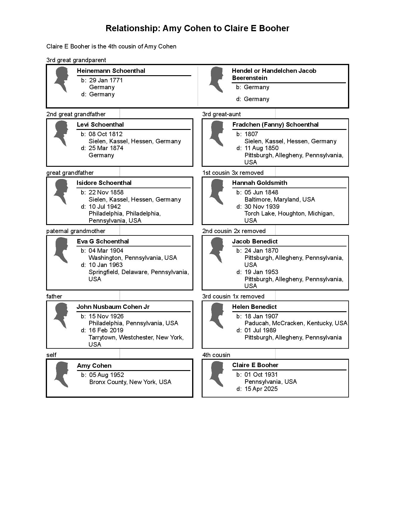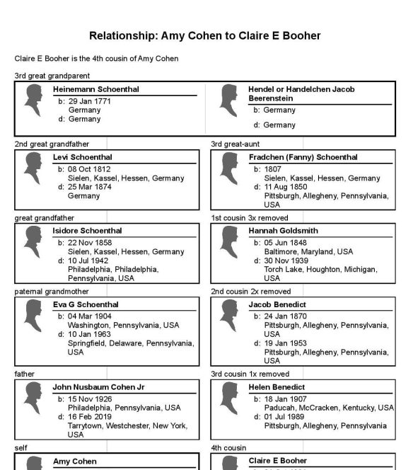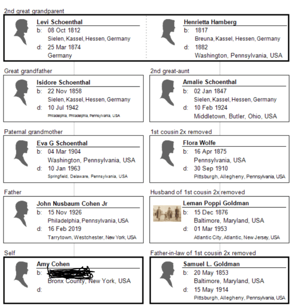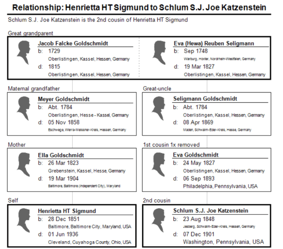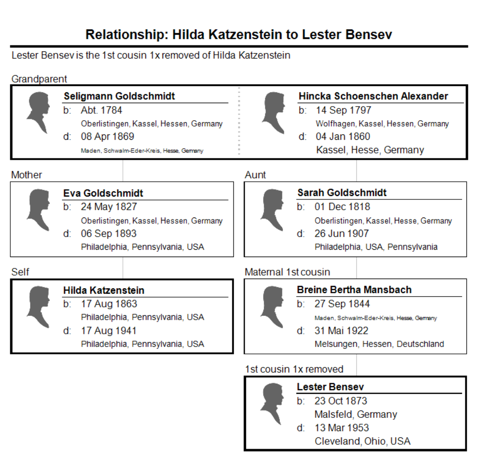 Hilda Katzenstein was the daughter of Eva Goldschmidt Katzenstein. Eva was the sister of Sarah Goldschmidt Mansbach. Sarah was the mother of Breine Mansbach Bensew. Breine was the mother of Lester Bensev, the groom who married Jennie Winheim. In other words, Hilda Katzenstein Schoenthal was Lester’s first cousin, once removed—his mother Breine’s first cousin.