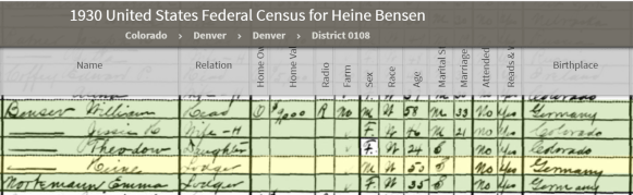 William Bensev household, 1930 US census, Census Place: Denver, Denver, Colorado; Page: 24A; Enumeration District: 0108; FHL microfilm: 2339972