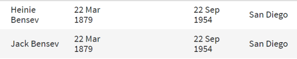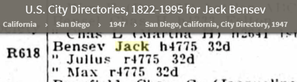 But what really threw me was that the 1920 Denver directory has a listing for both Jack Bensev and Heine Bensev, living at the same address as each other and William Bensev, both working as clerks, Jack for William Bensev. The 1925 and the 1940 Denver directories also have listings for both Jack and Heine, but other directories only list Jack.