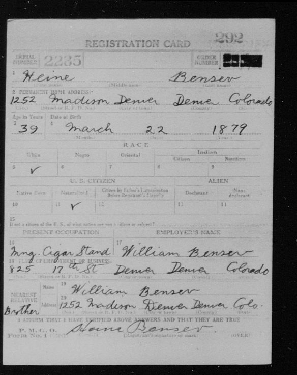 Lester’s older brother William was still in Denver during the years my great-grandparents and my grandmother were living there and thereafter. By 1918, perhaps to help William after Lester left the area, their brother Heine Bensev moved to Denver from Chicago. According to his World War I draft registration, Heine was working for his brother William as the manager of a cigar stand. In 1920, Heine was living with William and Jessie and their daughter Theodora: