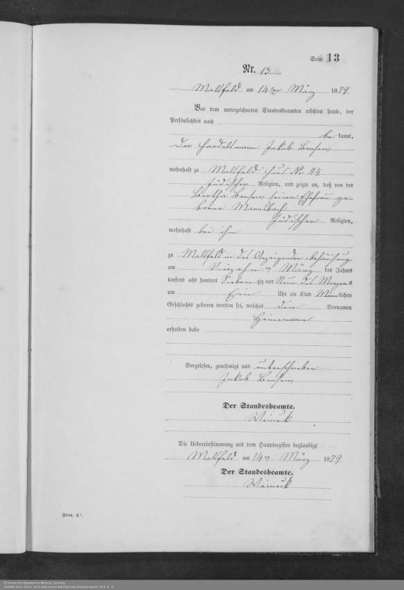 Heinemann Bensev birth record, Standesamt Malsfeld Geburtsnebenregister 1879 (HStAMR Best. 920 Nr. 4410)AutorHessisches Staatsarchiv MarburgErscheinungsortMalsfeld, p. 14