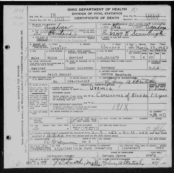 Lester died on March 13, 1953, in Cleveland, and his wife Jessie died three years later on August 16, 1956. He was 79 when he died, she was seventy. They were survived by their daughter Hortense and her family.