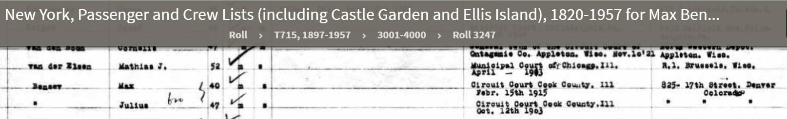 Meanwhile, the other two Bensev brothers also eventually moved to Denver. Like Heine, Max was naturalized in Chicago in 1915 and was the only brother still in Chicago in 1920. He was then rooming with a family and working as a salesman for a clothing store. Julius had moved to Gary, Indiana by 1920 where he was rooming with a family and working as a manager for an oil company, perhaps Standard Oil where he, Max, and Heine had been working in 1910 when they were all living together in Chicago.
