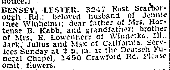 But Lester and Jennie Bensev did not stay in Denver for very long. By 1913 they had relocated to Cleveland, Ohio. Their daughter Hortense was born there on February 25, 1915. According to his World War I draft registration, Lester was employed as the store manager for Consumers Cigar Company in Cleveland in 1918. The 1920 census reported the same occupation. In 1930, Lester was working as an information clerk for a bank in Cleveland, but in 1940 he had returned to the cigar business.