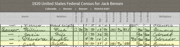Bensev household, 1920 US census, Census Place: Denver, Denver, Colorado; Roll: T625_162; Page: 3B; Enumeration District: 267, Ancestry.com. 1920 United States Federal Census