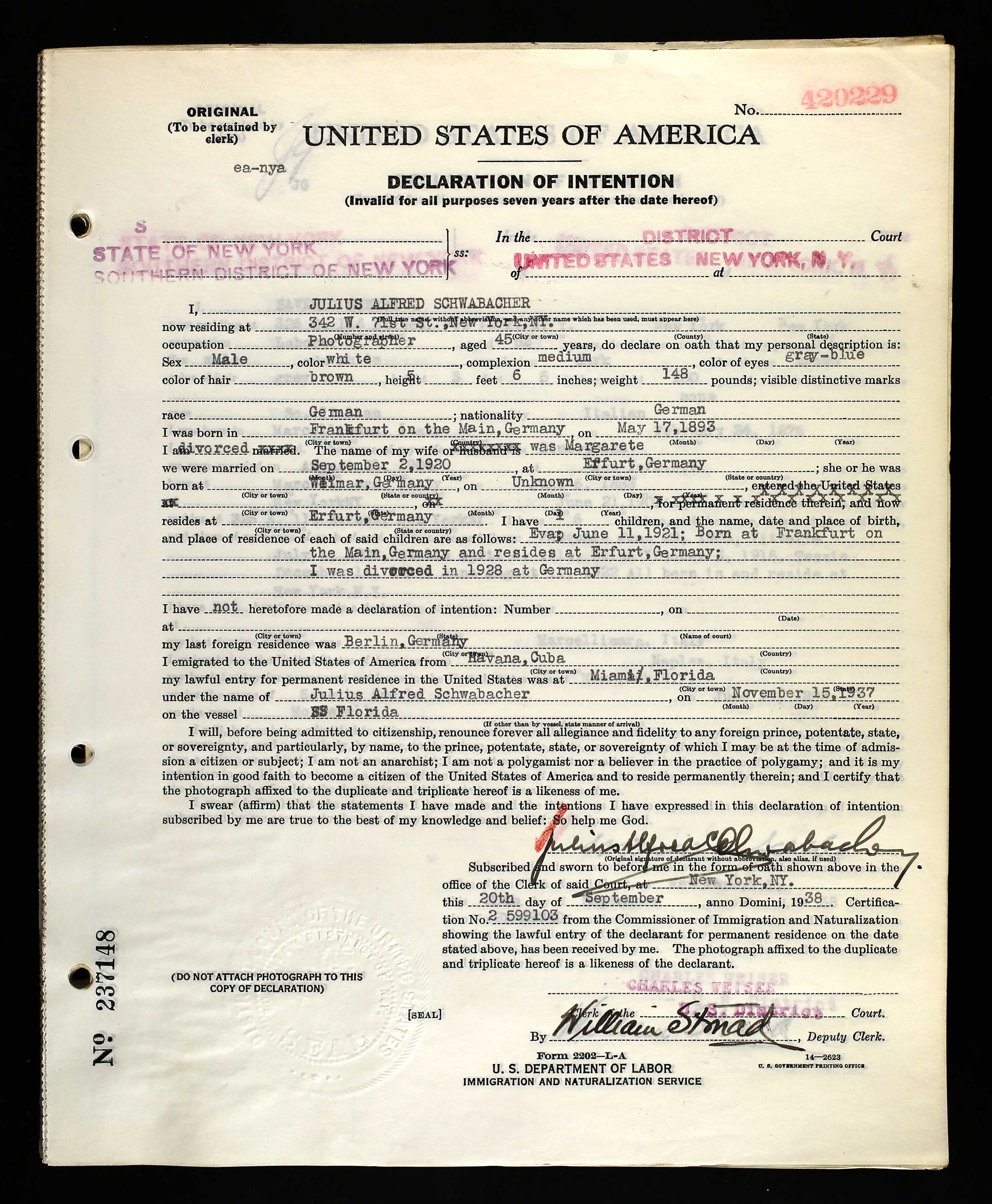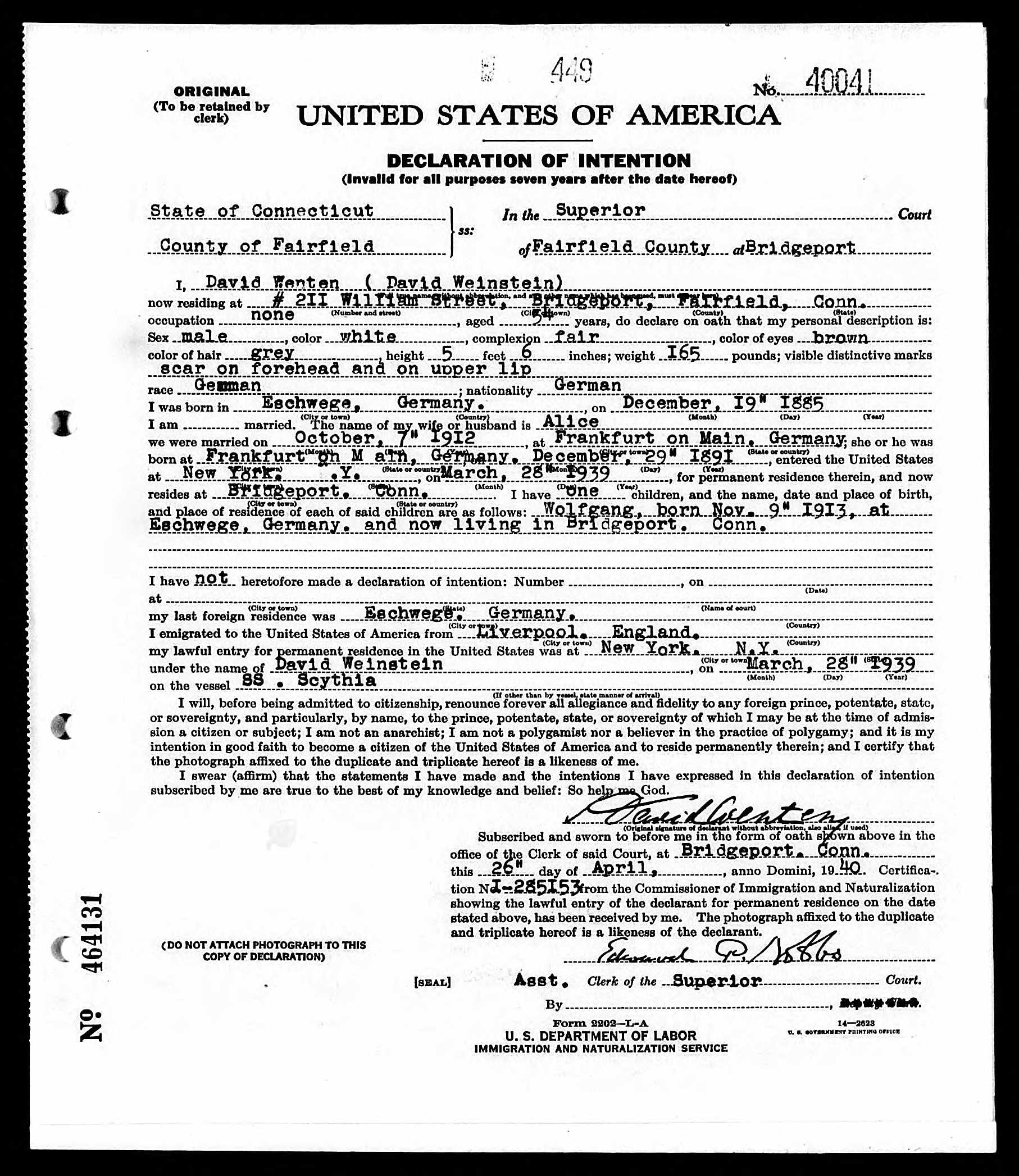 - Sigmund Adler, Naturalization Age 35, Record Type Naturalization, Birth Date 10 Mar 1886, Birth Place Germany, Naturalization Date 25 Oct 1921, The National Archives in Washington, DC; Washington, DC; Indexes to Naturalization Petitons For United States District Courts, Connecticut, 1851-1992 (M2081); Microfilm Serial: M2081; Microfilm Roll: 1, Ancestry.com. U.S., Naturalization Record Indexes, 1791-1992 (Indexed in World Archives Project) ↩
