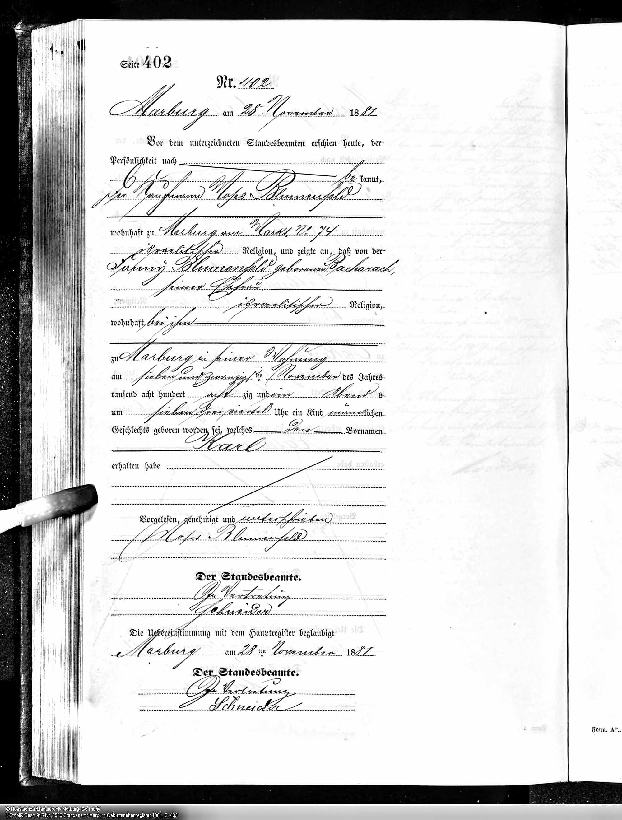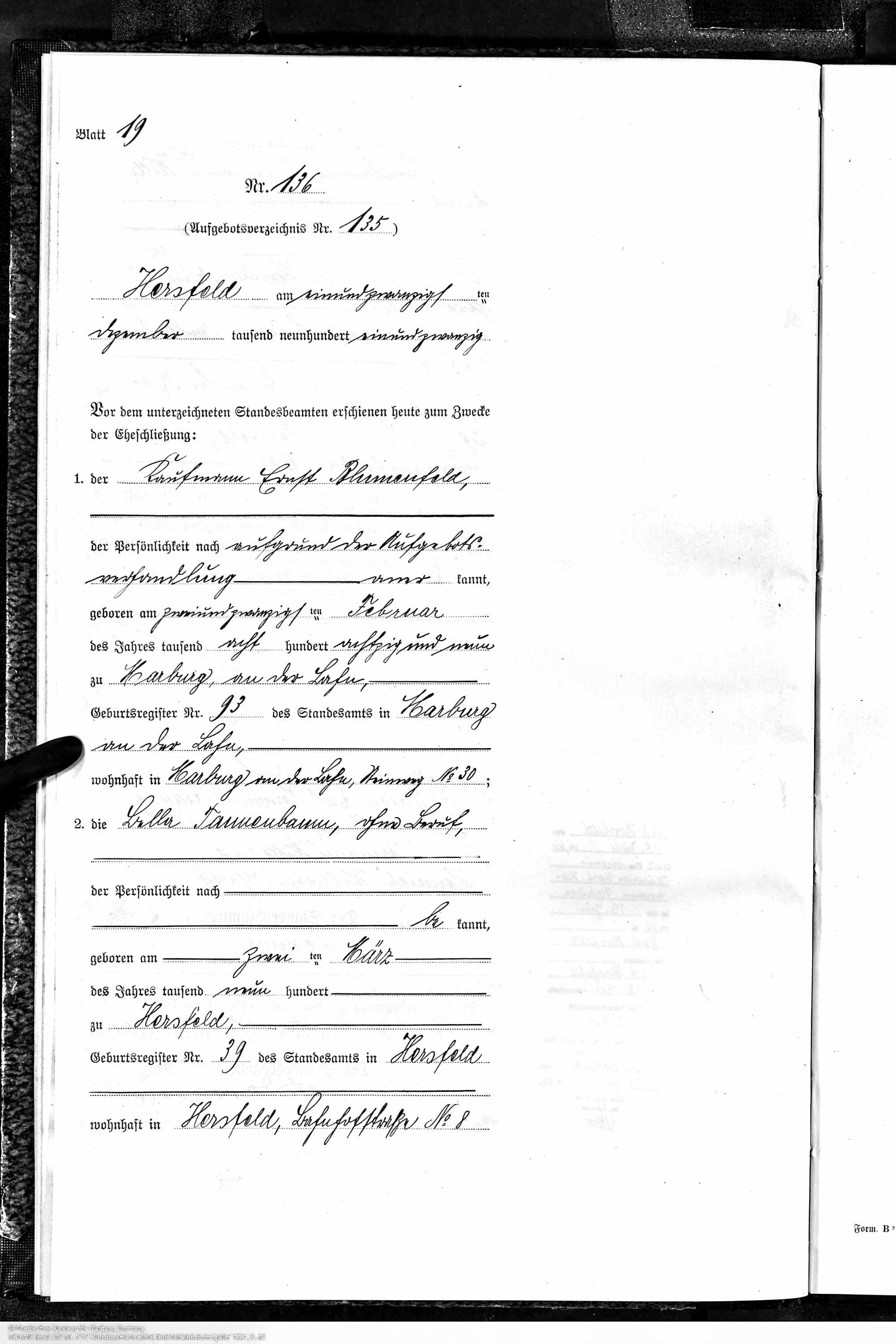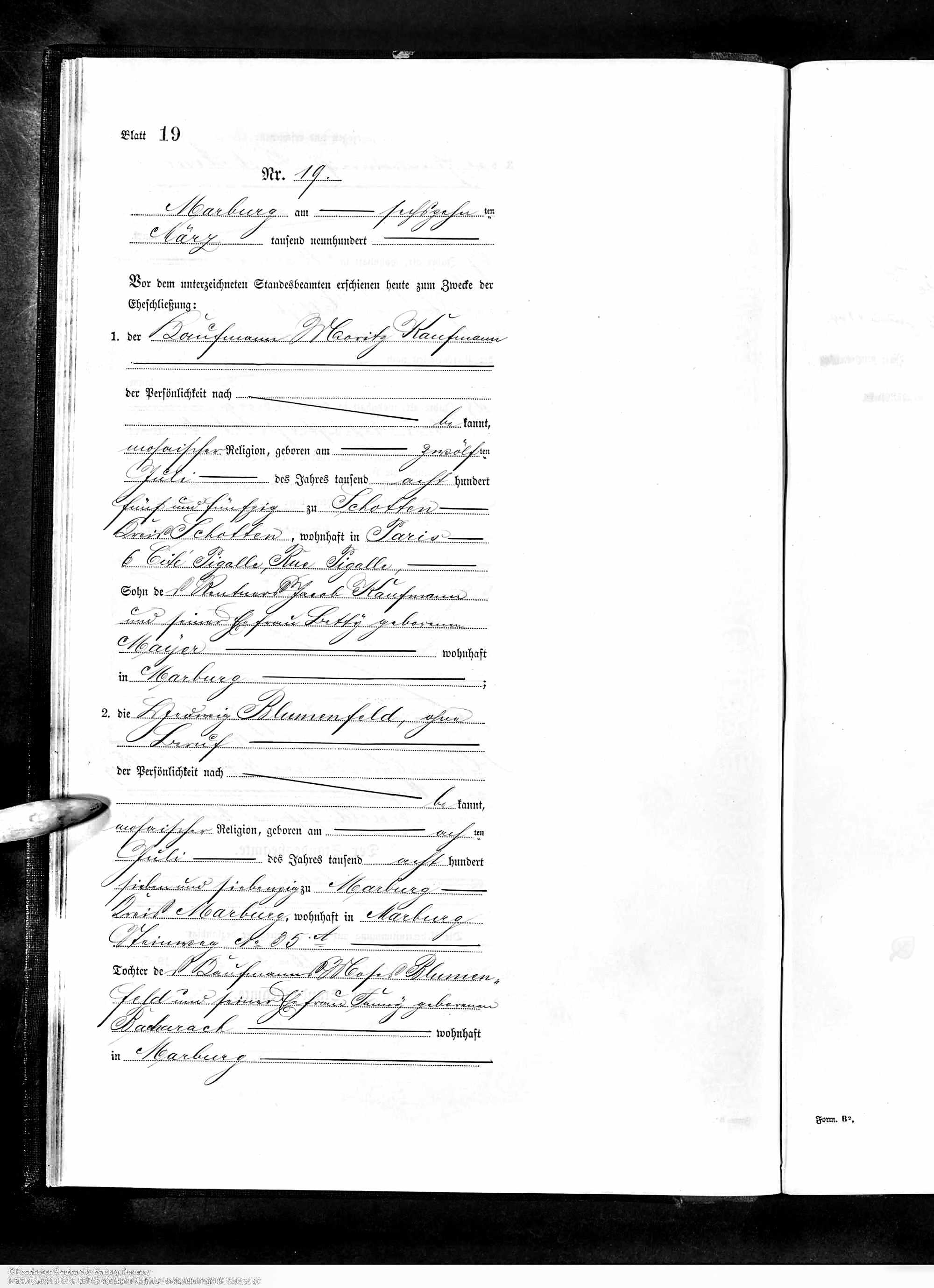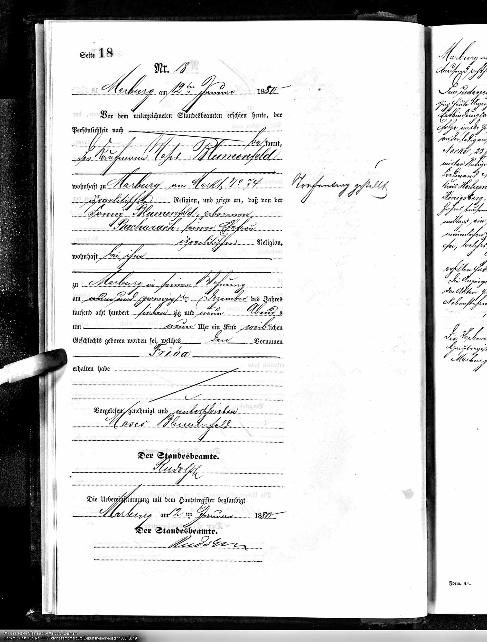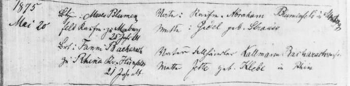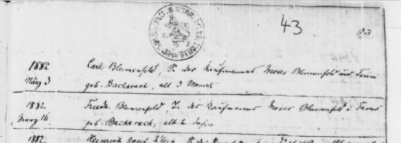 Salomon Blumenfeld, Robin’s great-great-grandfather, first married Caecilie Erlanger, but she died when she was only 24 years old, leaving behind two very young children: Thekla (Robin’s great-grandmother), not yet two, and Felix, just seven months old. Two years after his first wife Caecilie died, Salomon married Emma Bendheim and had a third child, Moritz, in 1877. And then sometime within the next five or six years, Salomon left Germany for Spain with Emma and Moritz, leaving his first two children, Thekla and Felix, behind. As best I can tell, Thekla and Felix, still both young children, must have been raised by their mother’s family, the Erlangers, in Marburg.