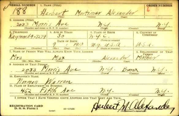 - Max Alexander and family, 1940 US census, Year: 1940; Census Place: New York, Bronx, New York; Roll: m-t0627-02493; Page: 6B; Enumeration District: 3-1303A, Ancestry.com. 1940 United States Federal Census ↩