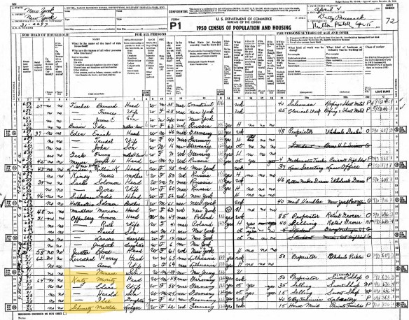 Meanwhile, in 1950 Moritz, Clara, Hal, and Ilse were still living in Washington Heights. Moritz and Clara were working in the sweet shop they owned, as was their son Hal. Ilse was working as an x-ray technician in a laboratory. Her daughter Karin told me that Ilse had become an x-ray technician after turning down a scholarship to Columbia because she could not afford not to work full time. The family also had one lodger living with them.