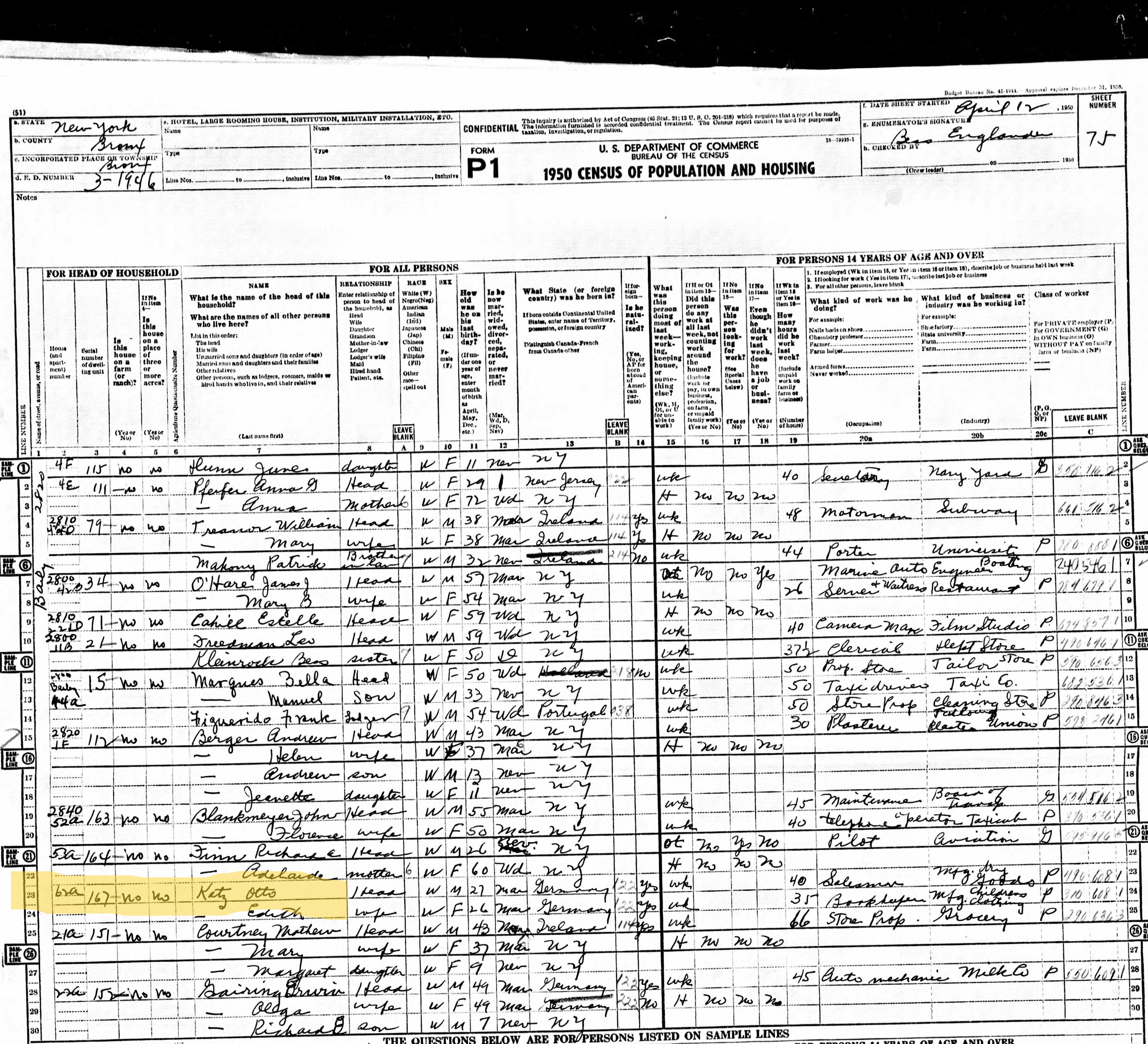 Moritz Katz and family 1950 US census, National Archives at Washington, DC; Washington, D.C.; Seventeenth Census of the United States, 1950; Year: 1950; Census Place: New York, New York, New York; Roll: 3572; Page: 72; Enumeration District: 31-2297, Ancestry.com. 1950 United States Federal Census
