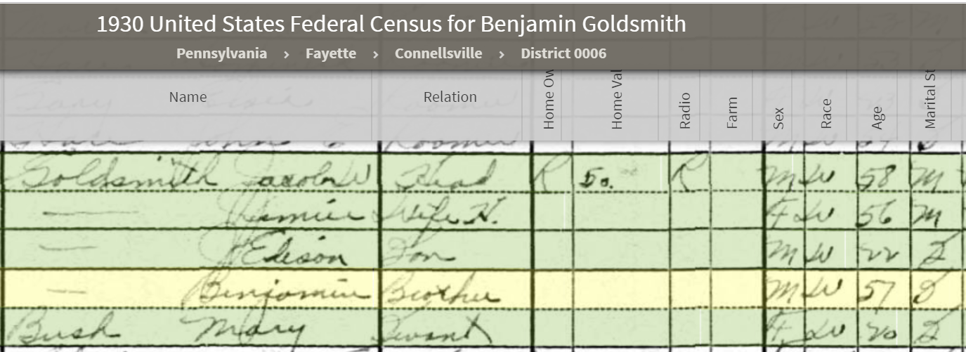 Next to Sol in the middle row is Ida Jaffa Mansbach. She was Samuel Jaffa’s daughter. Samuel was also a brother to Henry, Sarah, and Sol. Ida also married someone from the Goldschmidt/Goldsmith family. Her husband was Meyer Mansbach, son of Abraham Mansbach and Sarah Goldschmidt. Sarah was my 3x-great-aunt. She was the daughter of Seligmann Goldschmidt, my 3x-great-grandfather.