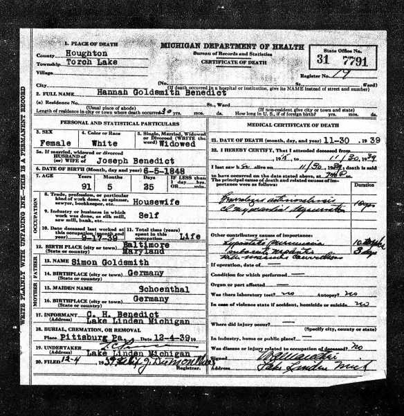 Thus, as of 1900, Ella Goldschmidt was a widow and had outlived four of her ten children: Jacob, Lena, William, and Stella. The 1900 census record says she had five living children, but I count six: Henrietta, Simon, Joseph, Leo, Mollie, and May. Soon, however, there would only be five. Perhaps Ella foresaw the doom of one more of her children.