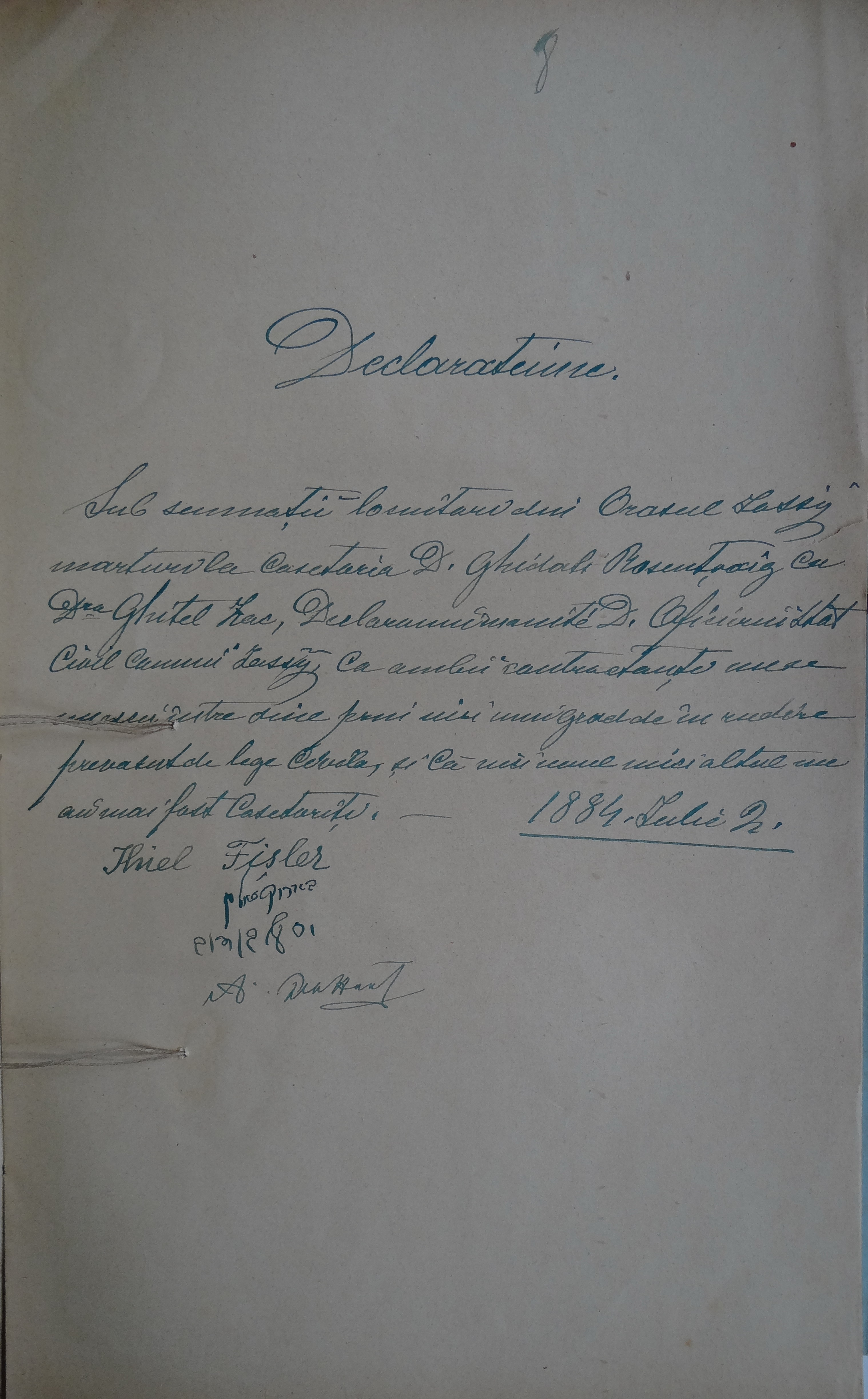 The second document is entitled “Testimony,” according to the translation provided by Marius. The translation simply reports that Ihiel Fisler, a witness to the wedding, attested to the fact that Ghidale and his bride Ghitla Zacu were not related under the Civil Code. The actual document, however, has four signatures, two written in Yiddish or Hebrew, two in the Latin alphabet. I have tried to decipher the ones written in the Hebrew alphabet, but would love some help if anyone knows Hebrew script better than I do.