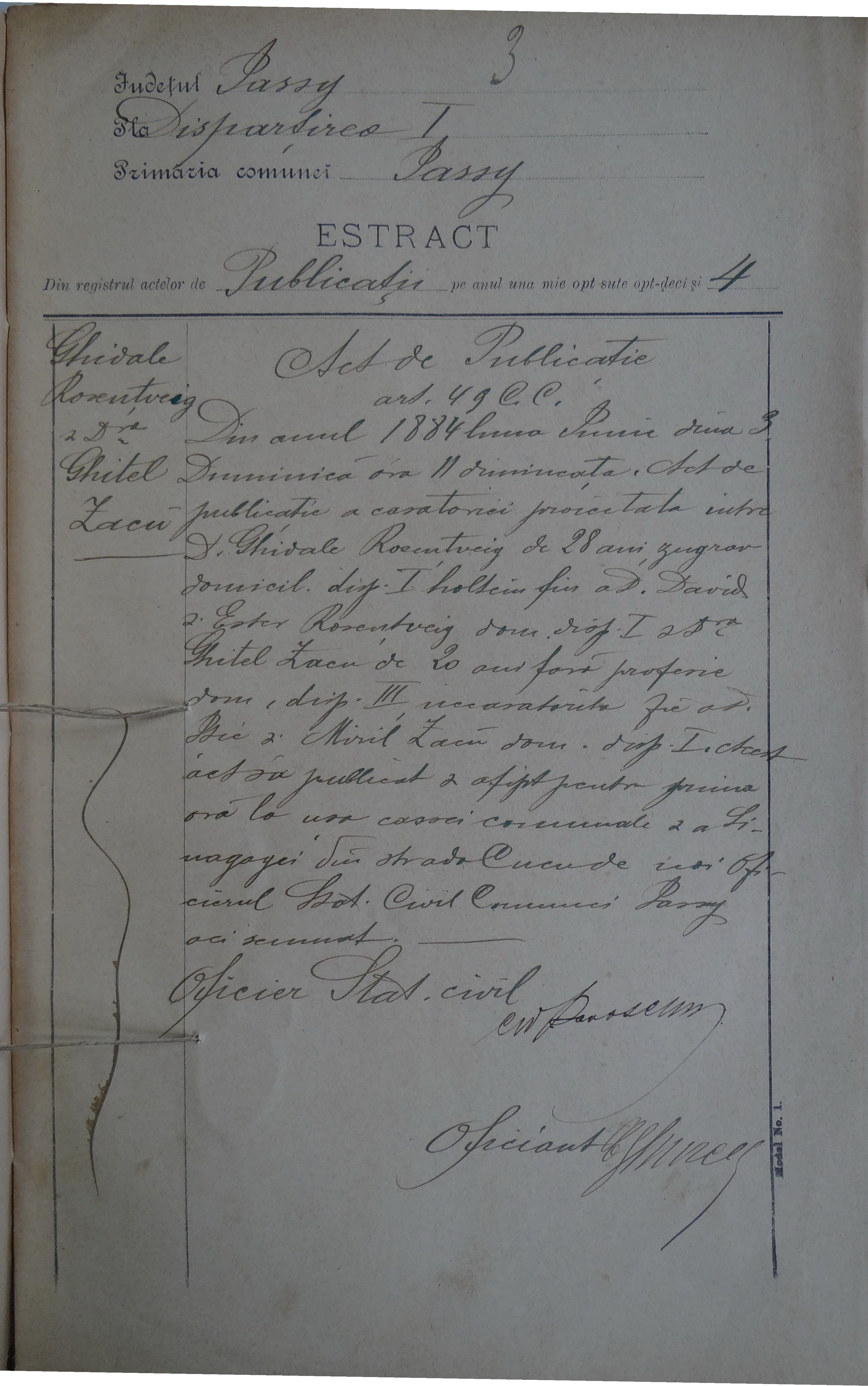 The remaining pages are the four pages of the marriage record itself, each one repeating what the other said, that is, that Ghidale Rosenzweig, 28 years old, son of David and Esther Rosenzweig, a painter by occupation, wanted to marry Ghitla Zacu, 20 years old, daughter of Itzic and Mirel Zacu, on June 1, 1884. Unfortunately, the translation Marius provided contains an error; it had the date as September 2, 1887, even though I could see the date was June (Iunie) 1, 1884 myself. I may ask him to provide a translation of each document separately, as it seems to me that there are some differences. Take a look and let me know what you think.