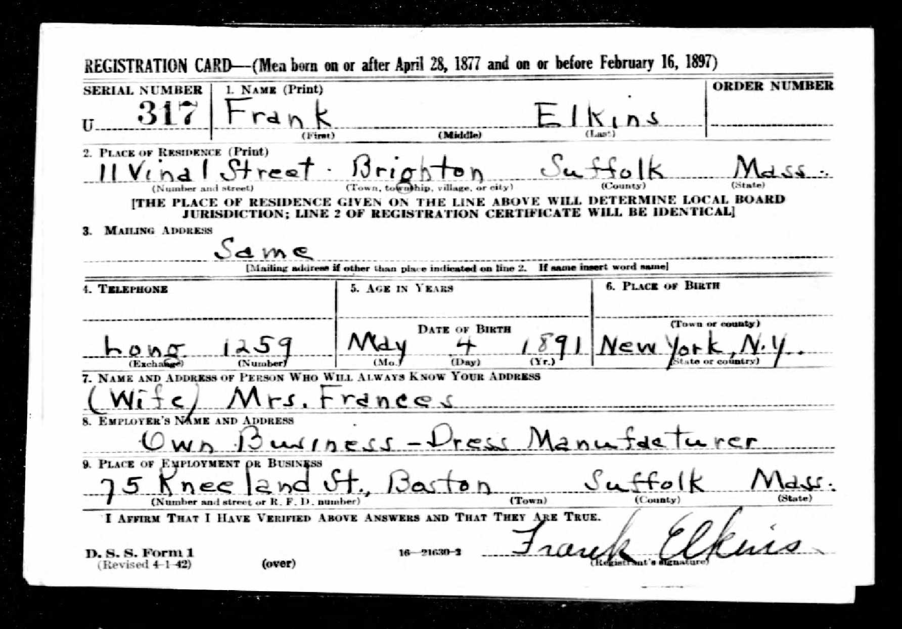 The National Archives at St. Louis; St. Louis, Missouri; World War II Draft Cards (Fourth Registration) for the State of Massachusetts; State Headquarters: Massachusetts; Microfilm Series: M2090; Microfilm Roll: 107