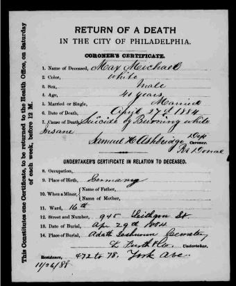 Rose Michael death certificate 1884 Pennsylvania, Philadelphia City Death Certificates, 1803-1915,” index and images, FamilySearch (https://familysearch.org/pal:/MM9.1.1/JKQJ-T8Z : accessed 17 December 2014), Rose Michael, 27 Apr 1884; citing , Philadelphia City Archives and Historical Society of Pennsylvania, Philadelphia; FHL microfilm 2,069,561.