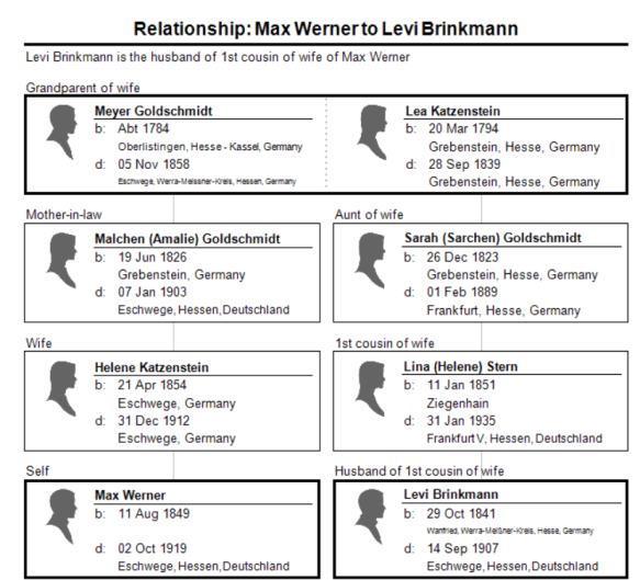 In addition, as Julius describes, Helene Katzenstein had previously been married to Levy Brinkmann’s brother Moritz, who died six years after they were married in 1872; Helene then married Max Werner. So Helene was both Levy Brinkmann’s sister-in-law and the first cousin of his wife Lina.]