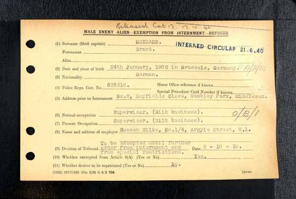 Ernst Heymann, he National Archives; Kew, London, England; HO 396 WW2 Internees (Aliens) Index Cards 1939-1947; Reference Number: Ho 396/178