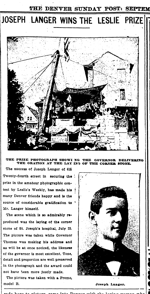 Fortunately, it was easier to find information about Lester’s older brother Joseph—largely because Joseph worked for a newspaper. In fact, I was able to find news coverage about Joseph dating back as early as 1899 when he was just twenty years old and won an amateur photography contest with a photograph of the then-governor of Colorado laying the corner stone for a hospital in Denver:
