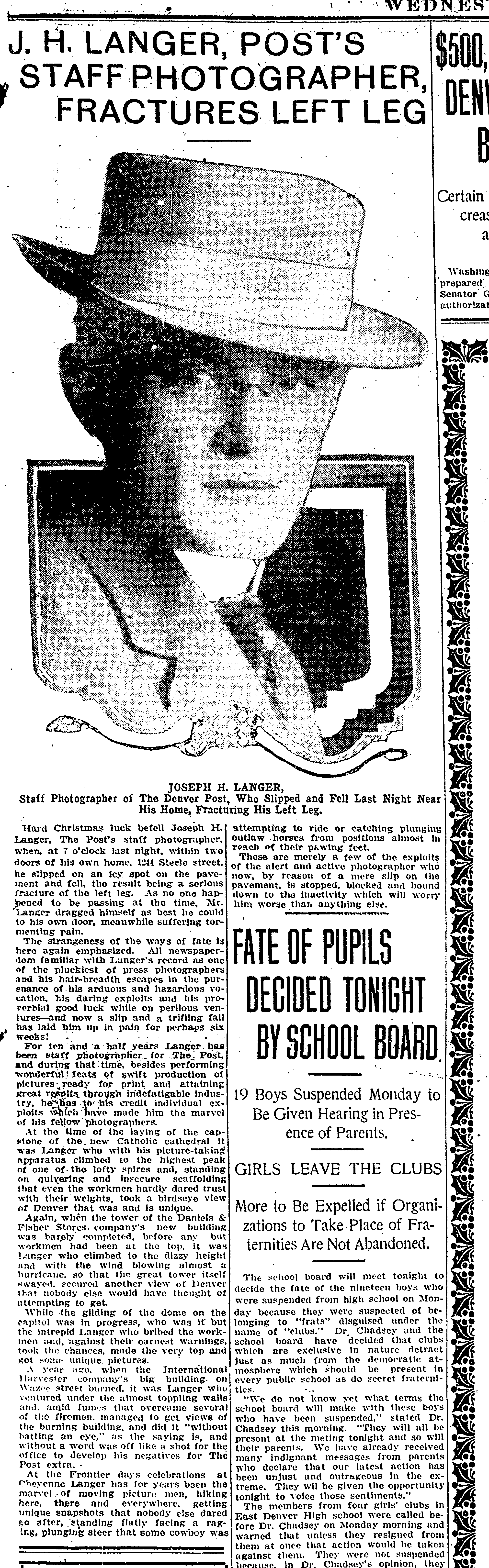 Sometimes Joe Langer was himself the subject of articles, as in this 1911 article written when he broke his leg after slipping on ice. The newspaper wrote of the irony of him injuring himself this way in light of the risks he had taken for his job: