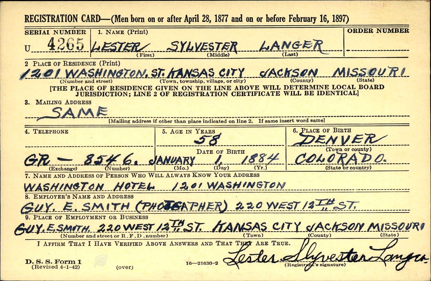 It was a challenge to learn much more about Lester, the younger of the two brothers. In 1940 he was still living in Kansas City, working as a photographer, and living at the Washington Hotel. According to the census record, he was married, but I found no other indication of a marriage, and he is not listed with another woman named Langer at the Washington Hotel.3 I believe this was an enumerator mistake, or Lester was lying. After all, he had listed his mother as his wife on his World War I draft registration. Lester was still living at the Washington Hotel two years later when he registered for the World War II draft (he was then 58 years old). And he was still working as a photographer—for Guy E. Smith.