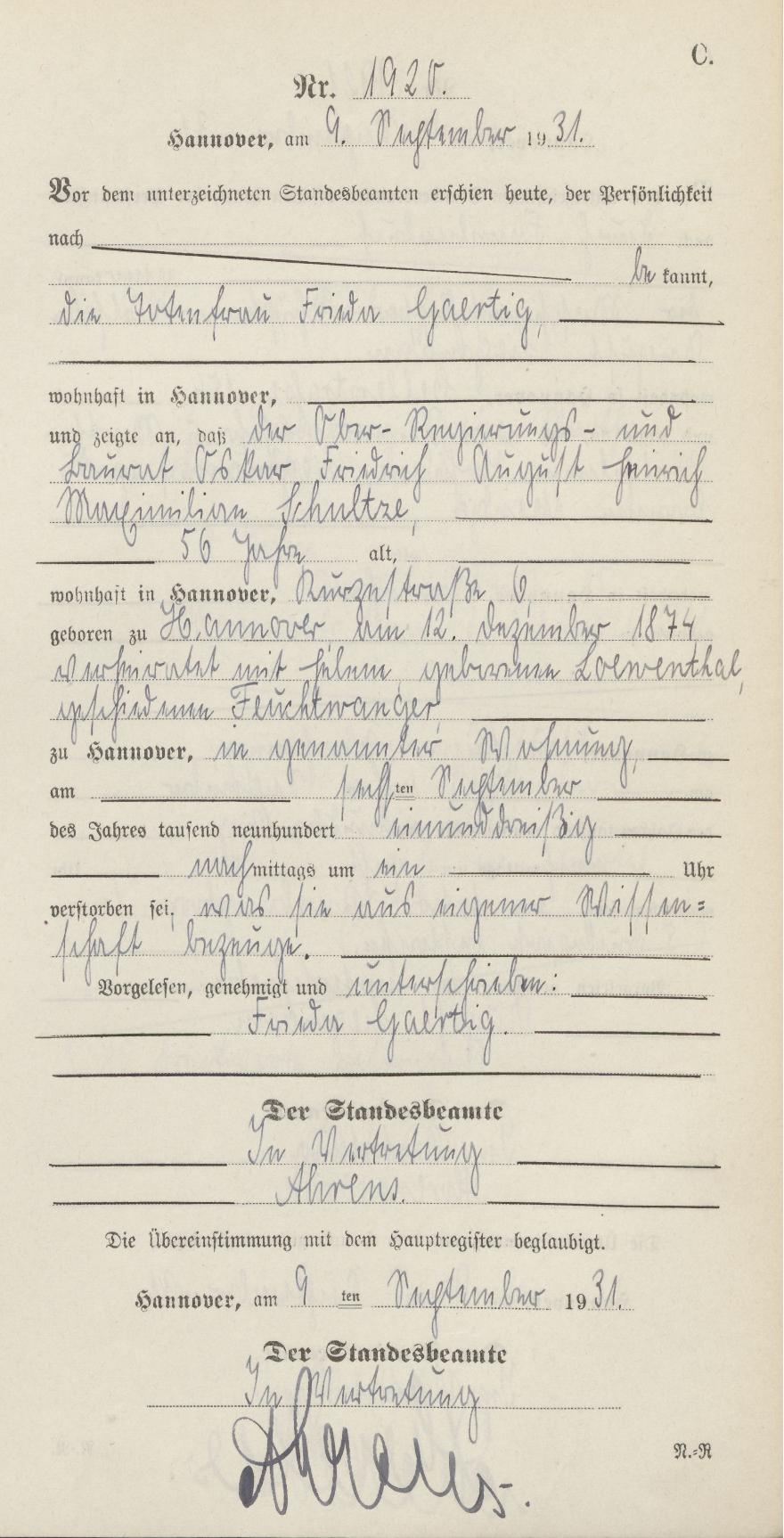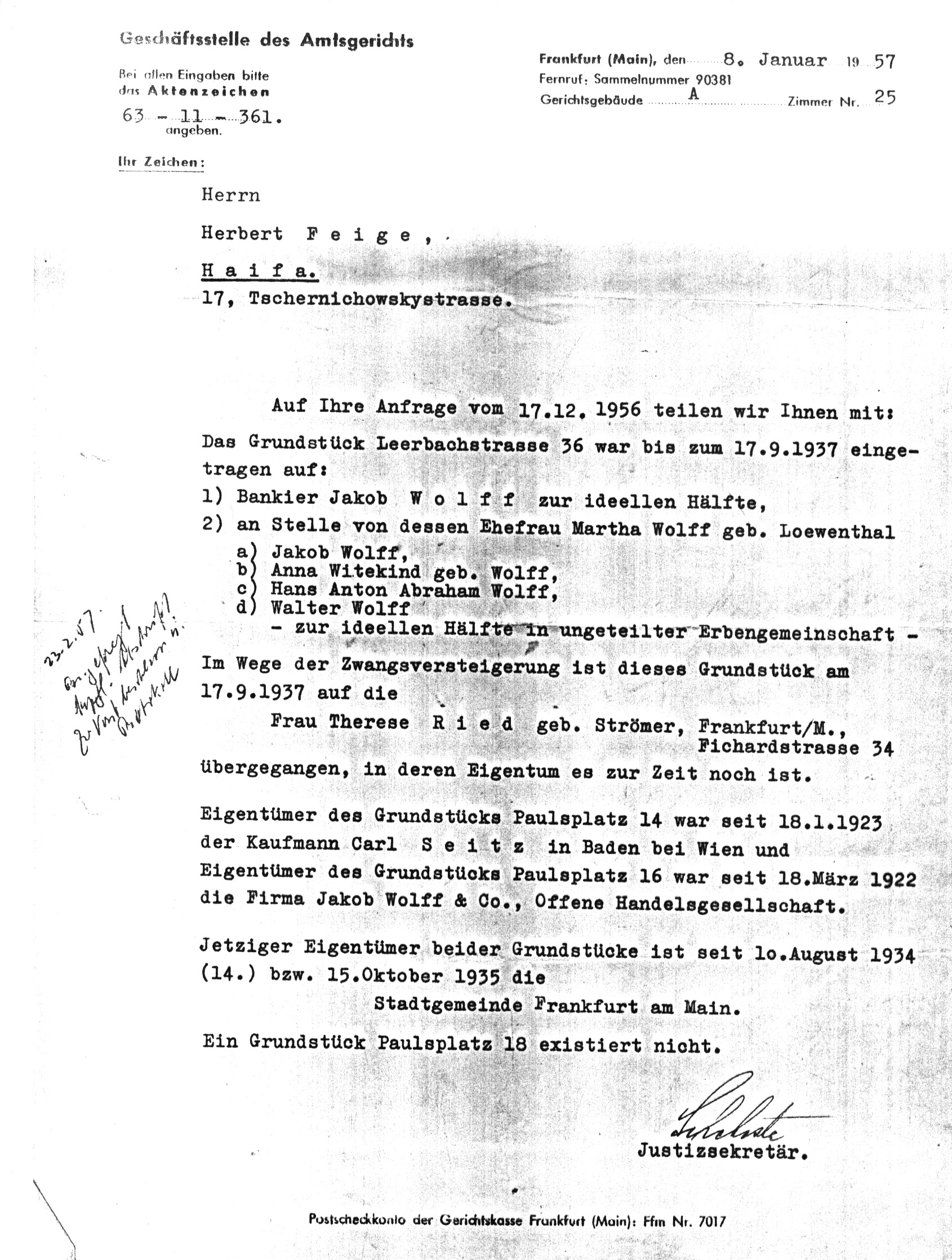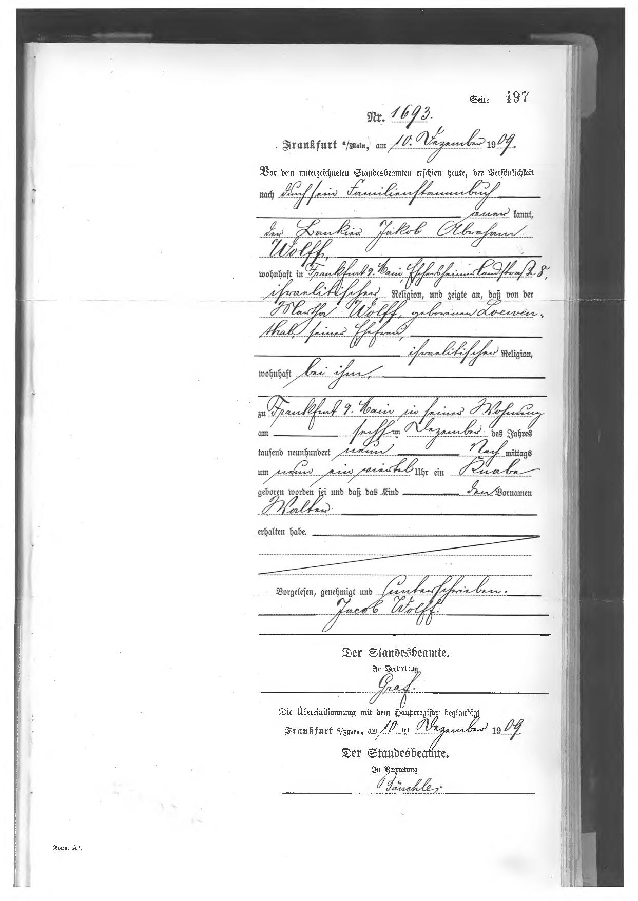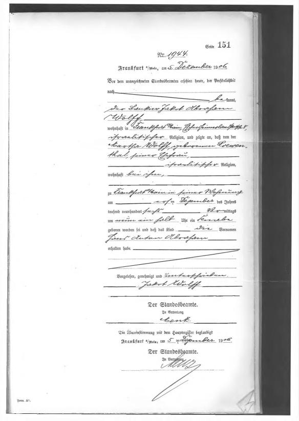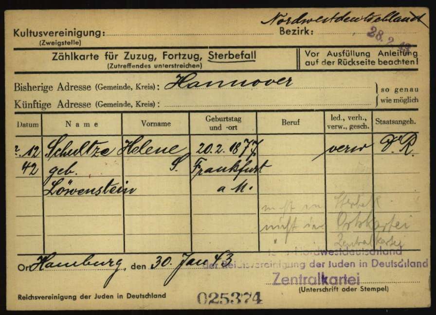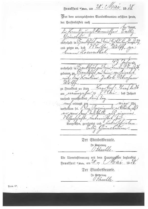During the second night of our stay in the Hotel in Kassel, the Hotel was checked by the Gestapo. We were not bothered this time, but preferred to move to Frankfurt where no Hotel accepted us. We took refuge in the empty Apartment of my niece Lotte Posen, my brother Siegfried’s daughter. Her husband had been arrested, and she had moved to her parents.