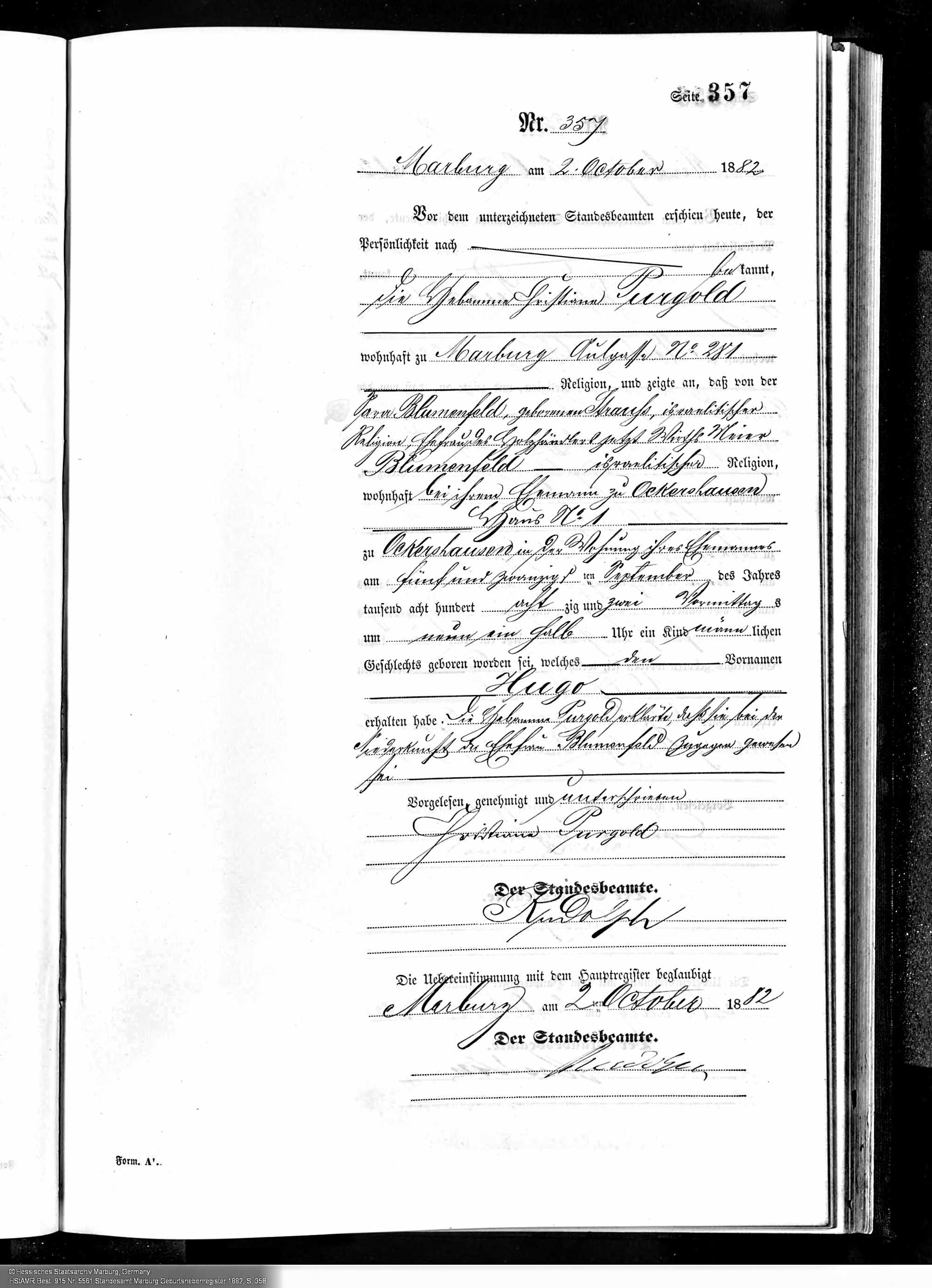 Felix Blumenfeld marriage to Thekla Wertheim, Hessisches Hauptstaatsarchiv; Wiesbaden, Deutschland; Bestand: 903, Year Range: 1902, Ancestry.com. Hesse, Germany, Marriages, 1849-1930