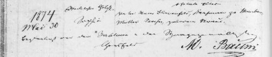 As best I can tell, both children remained in Germany, probably with their mother’s family. Supporting that hypothesis is the fact that when Thekla married Max Gruenbaum on June 15, 1894, they were married in Marburg, the town where Caecilie Erlanger was born and where her parents and brother were still living in the 1880s. Note also that the witnesses were both named Erlanger.