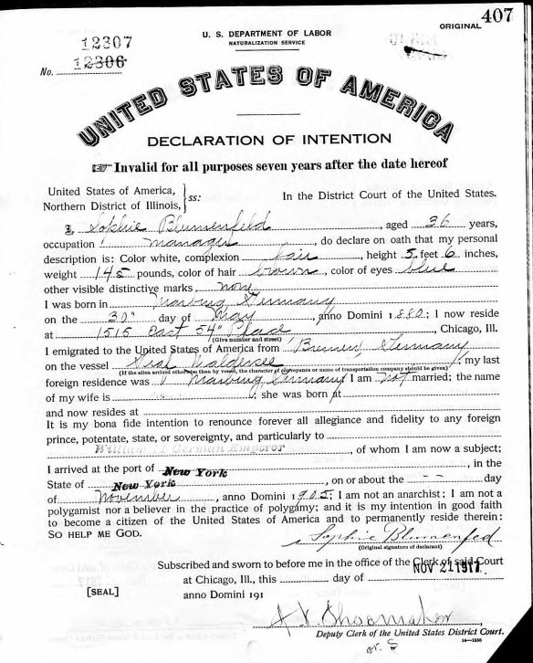 - Gerard Max Bloomfield, Declaration of Intention, National Archives at Chicago; Chicago, Illinois; ARC Title: Petitions for Naturalization, 1906-1991; Record Group Title: Records of District Courts of the United States, 1685-2009; Record Group Number: RG 21, Ancestry.com. Illinois, U.S., Federal Naturalization Records, 1856-1991 ↩
