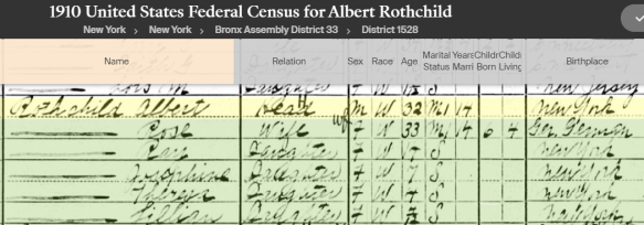 Joseph H Hall, Certificate Number 16959, New York State Department of Health; Albany, NY, USA; New York State Marriage Index, Ancestry.com. New York State, Marriage Index, 1881-1967. ↩ - Samuel Rothschild and family, 1925 NYS census, New York State Archives; Albany, New York; State Population Census Schedules, 1925; Election District: 72; Assembly District: 02; City: New York; County: Bronx; Page: 17, Ancestry.com. New York, U.S., State Census, 1925 ↩