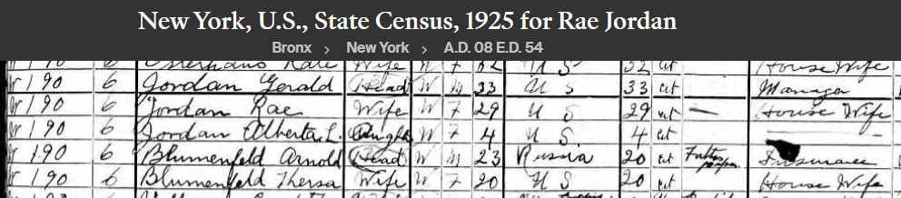 Gerald Jordan and family, Arnold Blumenfeld and family 1925 US census, New York State Archives; Albany, New York; State Population Census Schedules, 1925; Election District: 54; Assembly District: 08; City: New York; County: Bronx; Page: 20, Ancestry.com. New York, U.S., State Census, 1925