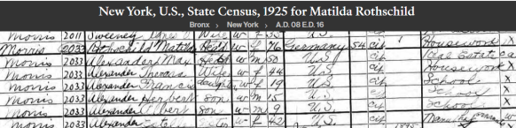 Mathilde Rothschild, Max Alexander and family 1925 NYS census, New York State Archives; Albany, New York; State Population Census Schedules, 1925; Election District: 16; Assembly District: 08; City: New York; County: Bronx; Page: 35, District: A·D· 08 E·D· 16, Ancestry.com. New York, U.S., State Census, 1925