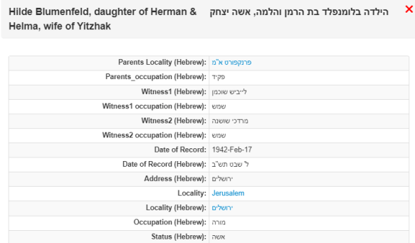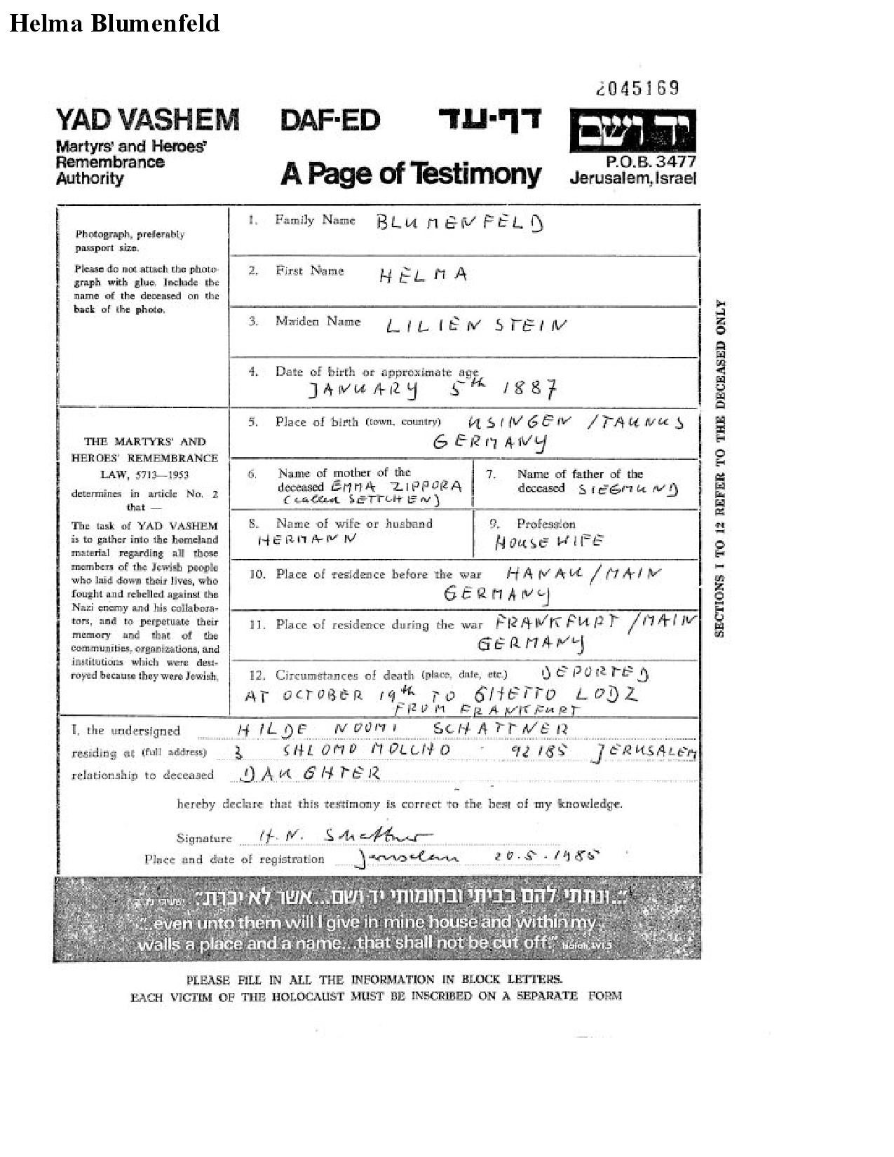 Fortunately, Hilde’s two siblings survived the Holocaust. Erich Blumenfeld immigrated to Palestine on September 13, 1937, and became a naturalized citizen there on December 19, 1939.3