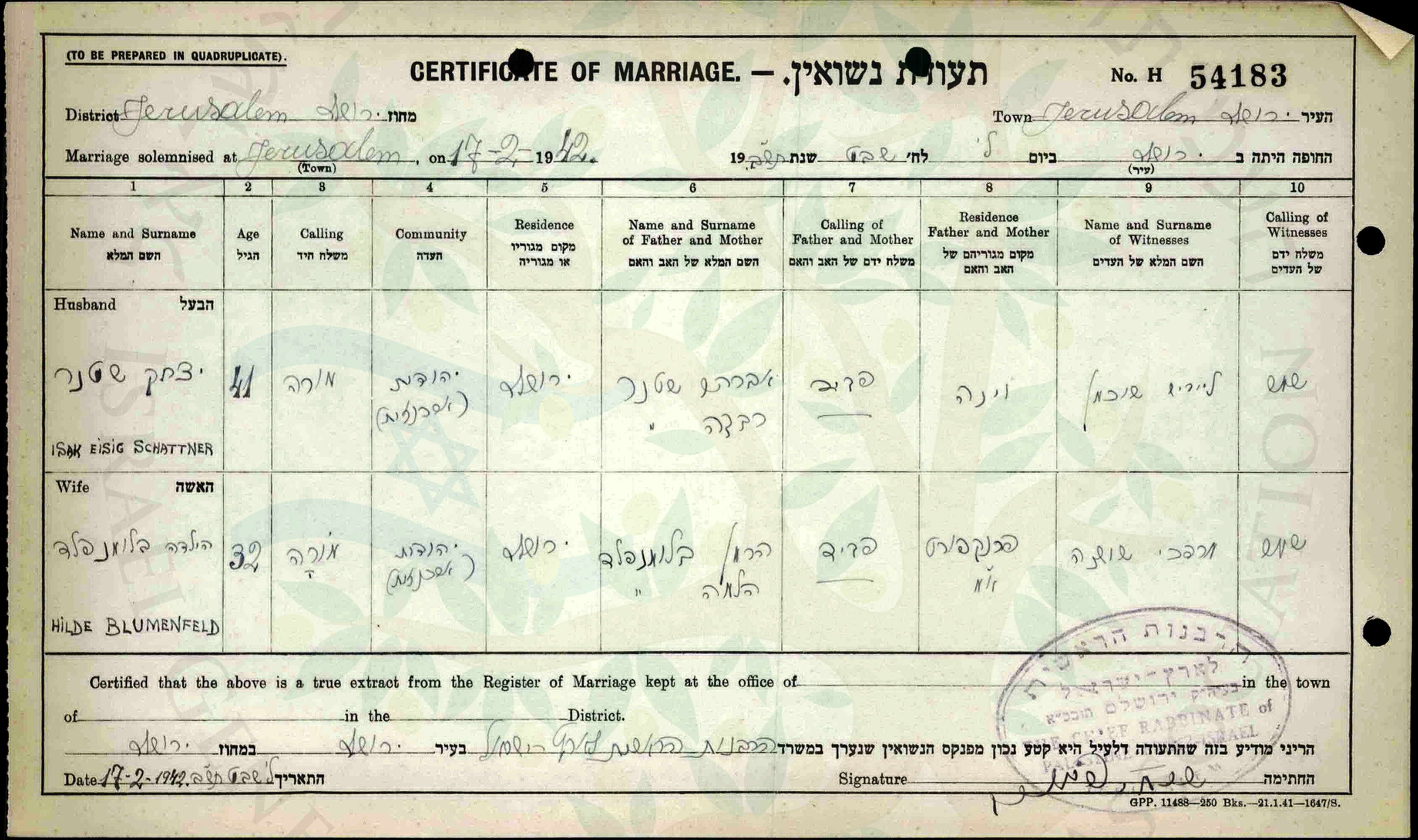 Yehuda Rothschild marriage record, Marriage/Divorce Certificates (תעודות נישואין / גירושין), part of the Marriages and Divorces 1921-1948 Palestine British (נישואין וגירושין 1948-1921 ארץ ישראל) database, document number 91714, IGRA number 507. The original records are from Israel State Archives (ארכיון המדינה), and was found at the IGRA website.