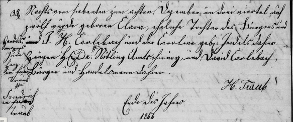 Nachts von seibenten zum achten dezember um drei viertel auf zwölf würde Clara, eheliche Tochter der Bürger und # (Handelsmannes) J. # (Juda) H. Carlebach und der Carolina gebr. Jeidels dahier. Zeugen Dr. # (Friederich) Nötling Amtschirurg, und David Carlebach, Bürger und Handelsmann dahier.