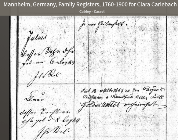 Julius Carlebach family, Ancestry.com. Mannheim, Germany, Family Registers, 1760-1900.