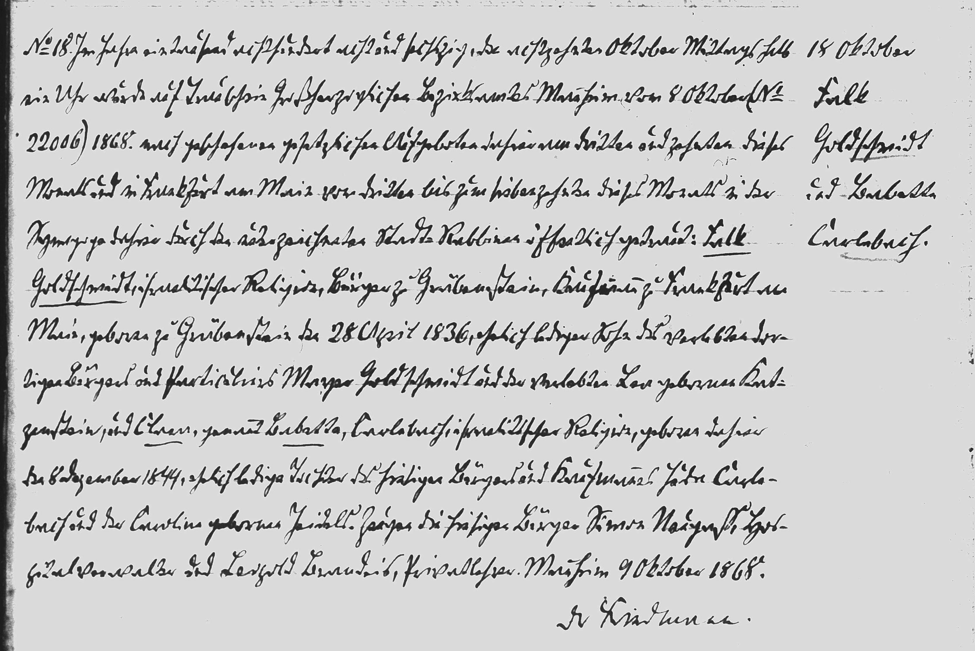In the year 1868, the 18th of October, in the afternoon at 3:30… The banns were read in Frankfurt/Main on the 3rd and 10th of October and published in Mannheim from the 3rd until 17th of October.