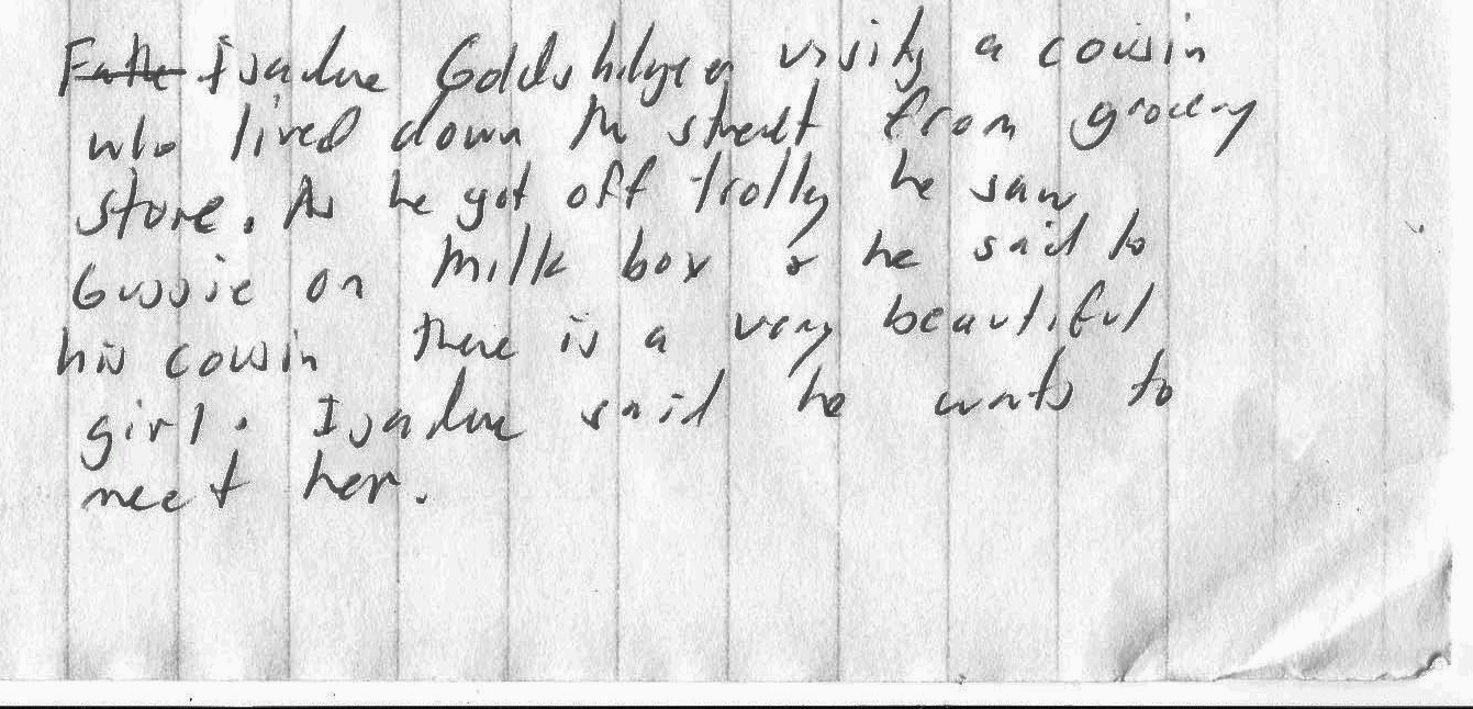 “Isidore Goldschlager visiting a cousin who lived down the street from the grocery store. As he got off the trolley he saw Gussie on milk box and said to his cousin there is a very beautiful girl.  Isadore said he wants to meet her.” (emphasis added)