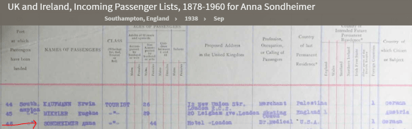 Ernst and Clementine Bodenheimer, Manfred and Ruth Sondheimer, Erich Sondheimer, ship manifest, Ancestry.com. UK and Ireland, Outward Passenger Lists, 1890-1960