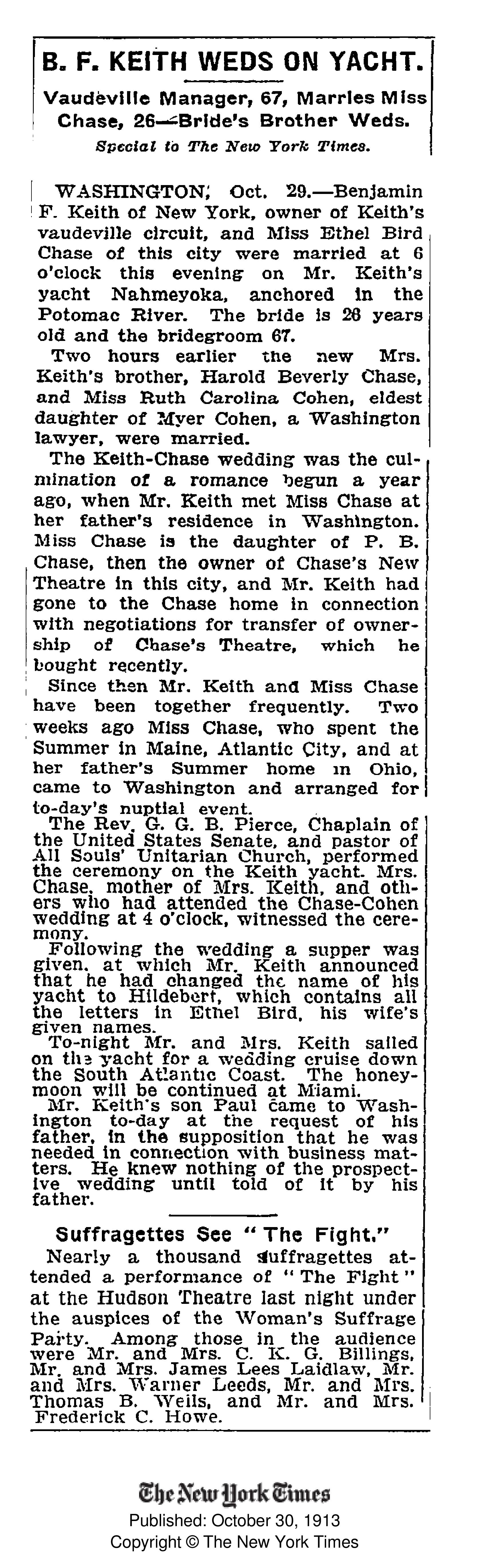 I wonder how Harold and Ruth felt about B.F. Keith and Ethel Chase stealing their thunder on their wedding day!