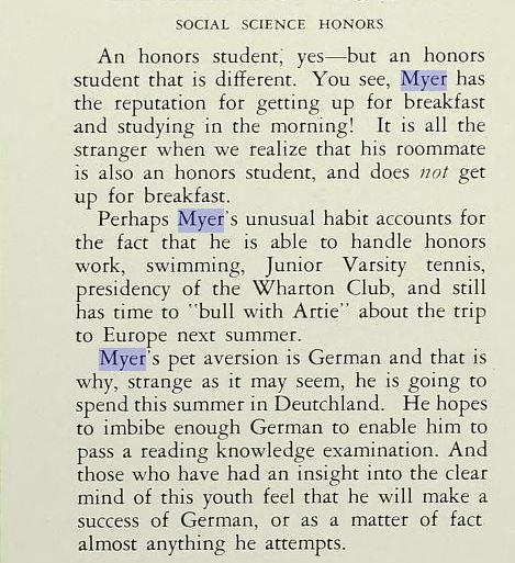 Myer, Jr., was still living at home in 1920 and in 1930. Myer went to Swarthmore College, where he was an honors student, a member of the Wharton Club, the Philosophy Club, and the Men’s Debate Club as well as on the staff of the yearbook, the Halcyon. This is how he was described in that yearbook: