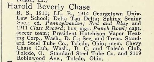 Harold B Chase U Penn alumni directory 1917 Ancestry.com. U.S., School Catalogs, 1765-1935 [database on-line]. Provo, UT, USA: Ancestry.com Operations, Inc., 2012. Original data: Educational Institutions. American Antiquarian Society, Worcester, Massachusetts