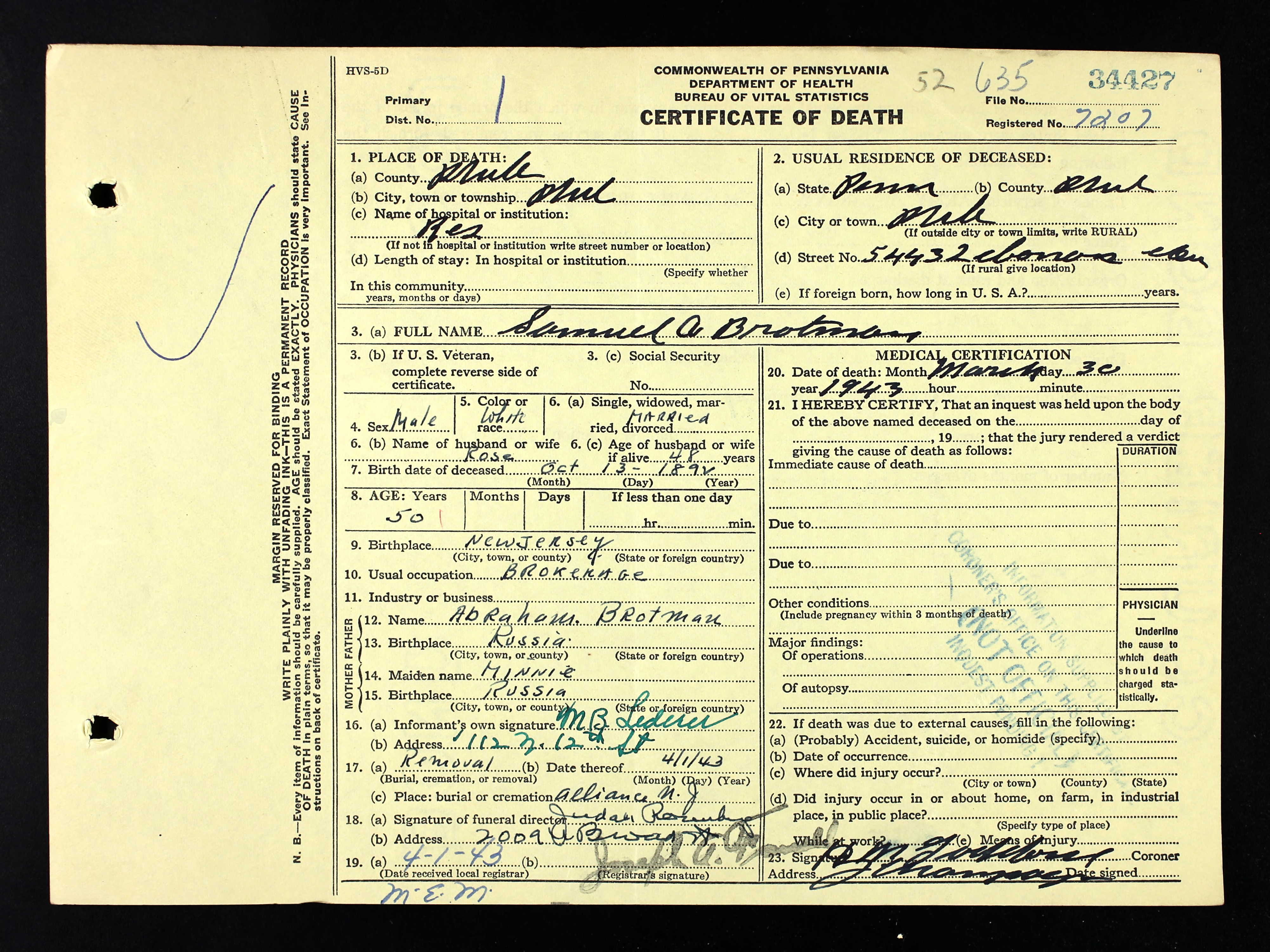 Samuel Brotman death certificate
