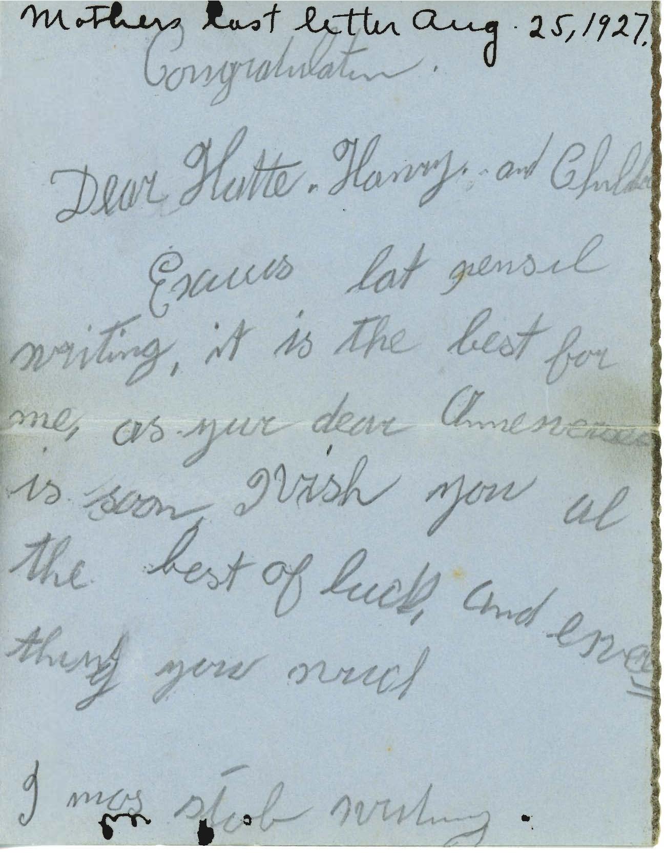 Hettie survived her much beloved husband Henry by almost 38 years, dying on January 15, 1989, when she was just a few months shy of her 103rd birthday. She, like so many of her siblings, was blessed with remarkable longevity.