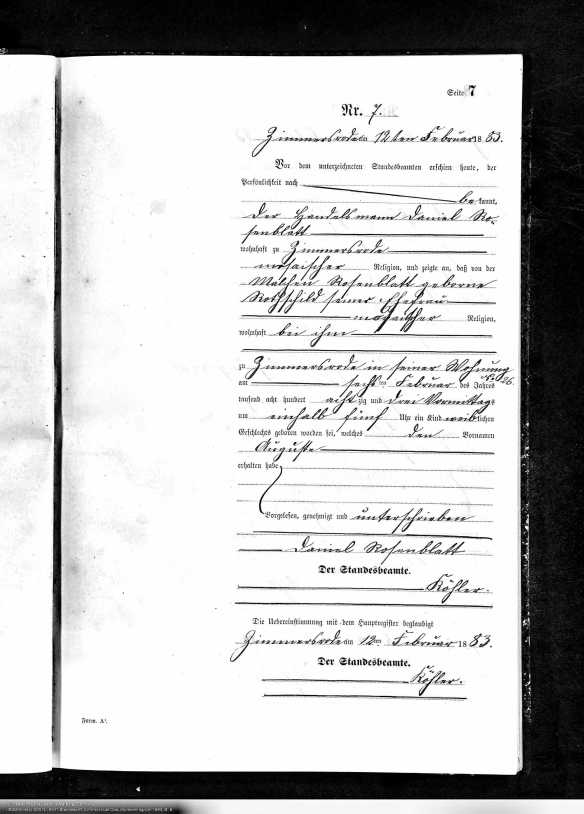 Siegmund Rosenblatt birth record, Hessisches Hauptstaatsarchiv; Wiesbaden, Deutschland; Bestand: 920; Laufende Nummer: 9527, Year Range: 1889. Ancestry.com. Hesse, Germany, Births, 1851-1901