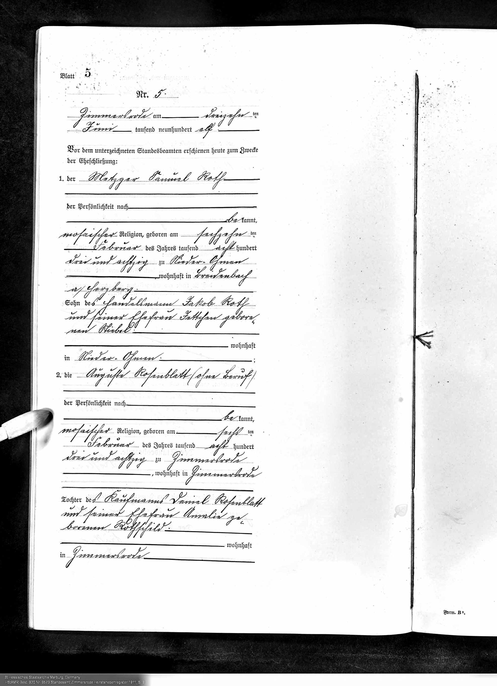 Auguste Rosenblatt and Samuel Solly Roth marriage record, Hessisches Hauptstaatsarchiv; Wiesbaden, Deutschland; Bestand: 920; Laufende Nummer: 9573, Year Range: 1911, Ancestry.com. Hesse, Germany, Marriages, 1849-1930
