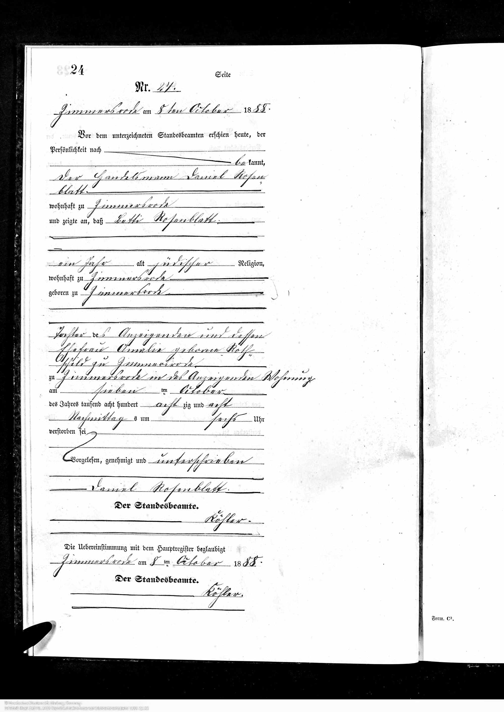 After Juda came Betty Rosenblatt, born January 8, 1887, in Zimmersrode. Sadly, Betty did not make it to her second birthday; she died on October 7, 1888, in Zimmersrode.