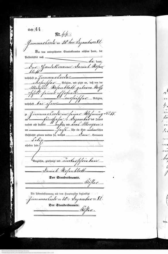 Felix Rosenblatt birth record, Hessisches Hauptstaatsarchiv; Wiesbaden, Deutschland; Bestand: 920; Laufende Nummer: 9519, Year Range: 1881, Ancestry.com. Hesse, Germany, Births, 1851-1901
