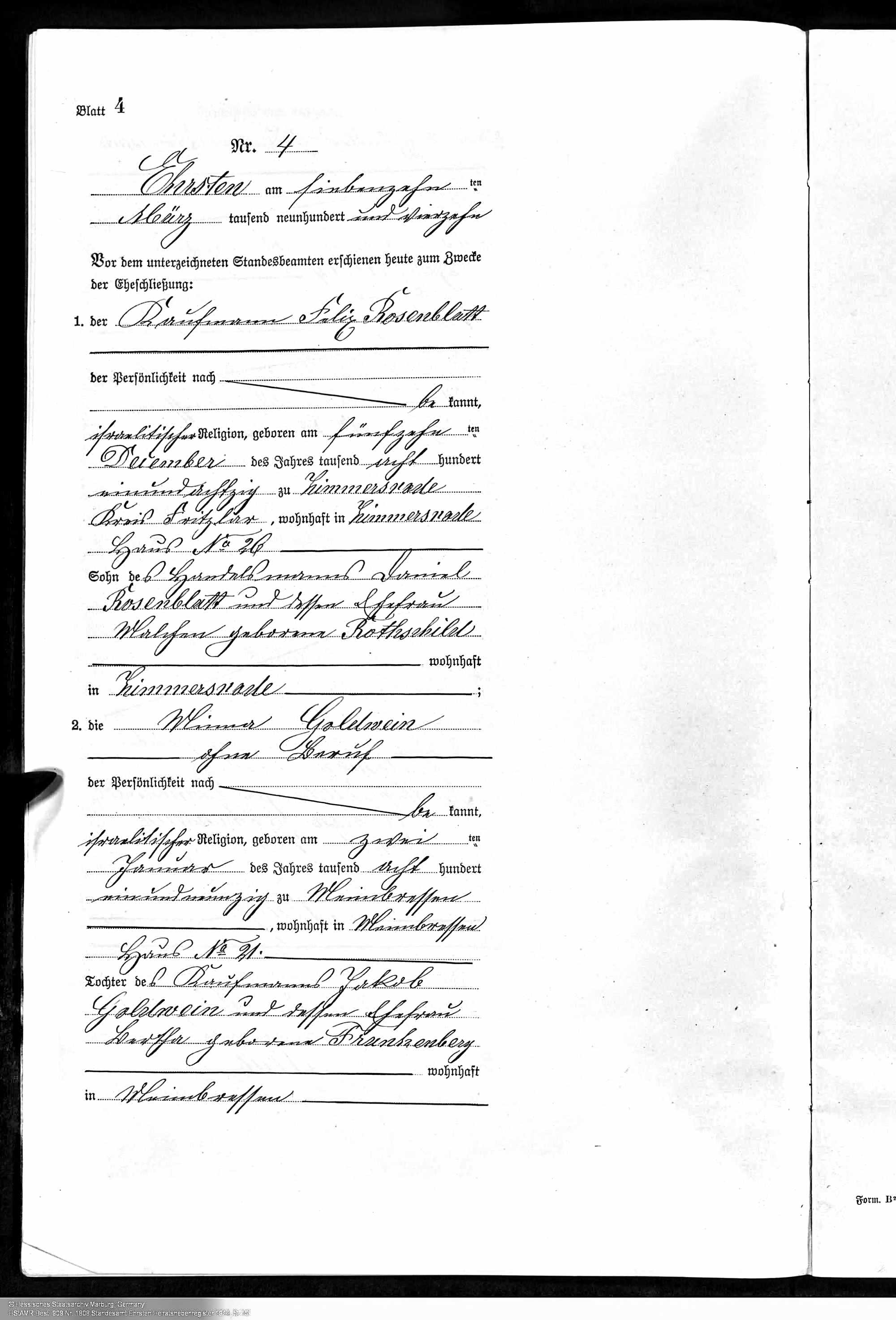 Felix Rosenblatt and Minna Goldwein marriage record, Hessisches Hauptstaatsarchiv; Wiesbaden, Deutschland; Signatur: 1808, Year Range: 1914, Ancestry.com. Hesse, Germany, Marriages, 1849-1930